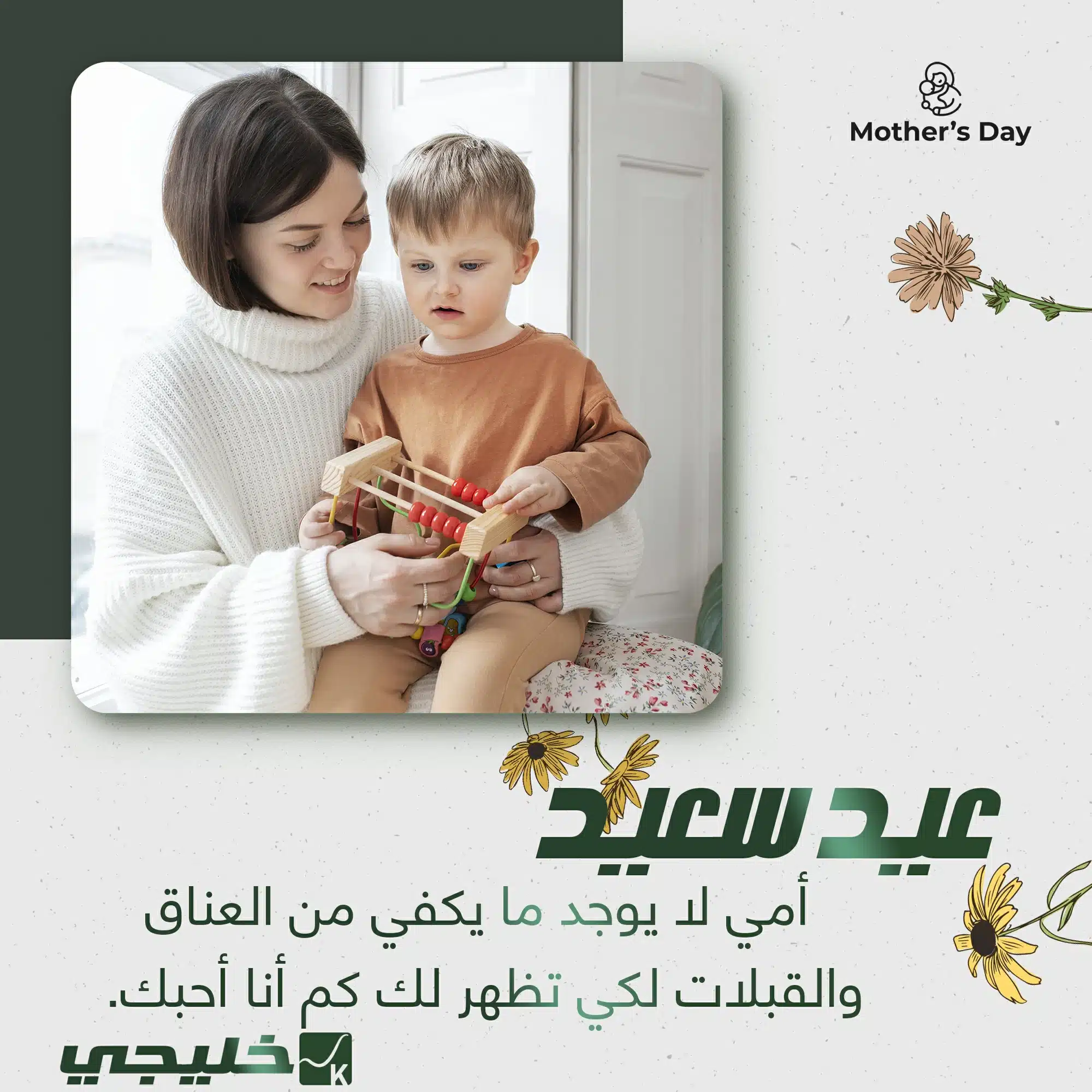• اجمل صور  والتي تتضمن عبارة عيد سعيد مع الزهور الصفراء وتظهر فيها صورة مصغرة للطفل ووالدته.