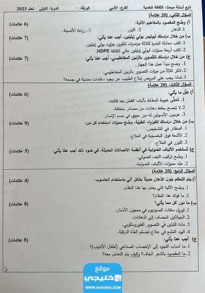 اسئلة امتحان الثقافة الثانوية العامة في فلسطين الصفحة 1