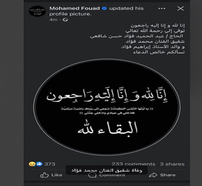 ” (إنا لله وإِنا إليه راجعون)، توفي إلى رحمة الله تعالى: الحاج عبد الحميد فؤاد عبد الحميد حسن شافعي، شقيق الفنان محمد فؤاد ووالد الأستاذ إبراهيم عبد الحميد فؤاد، نسألكم خالص الدعاء.”